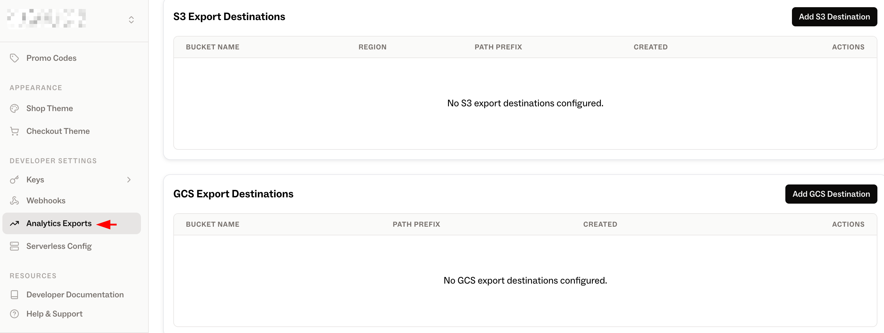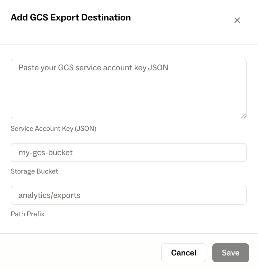 Open the Neon Console and navigate to Developer Settings -> Analytics Exports. Click “Add GCS Destination”, then enter the information obtained in Step 4.