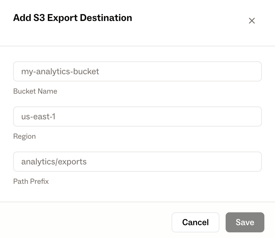 Click “Add S3 Destination” and enter the Bucket Name, Region, and Path Prefix. The Path Prefix defines the folder where analytics exports will be stored. We recommend using a unique prefix per title to keep analytics data organized across multiple titles.
