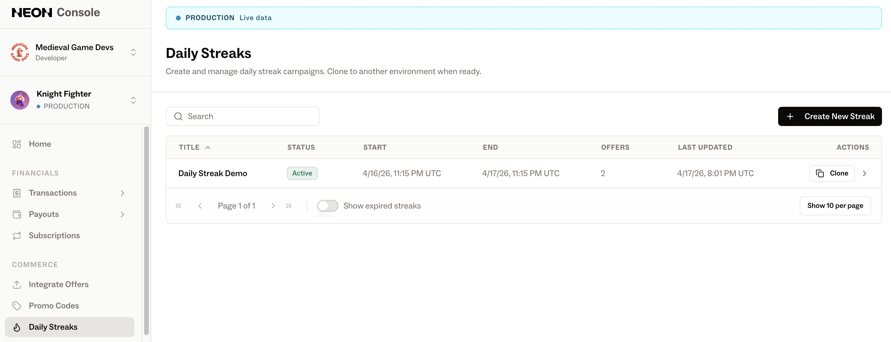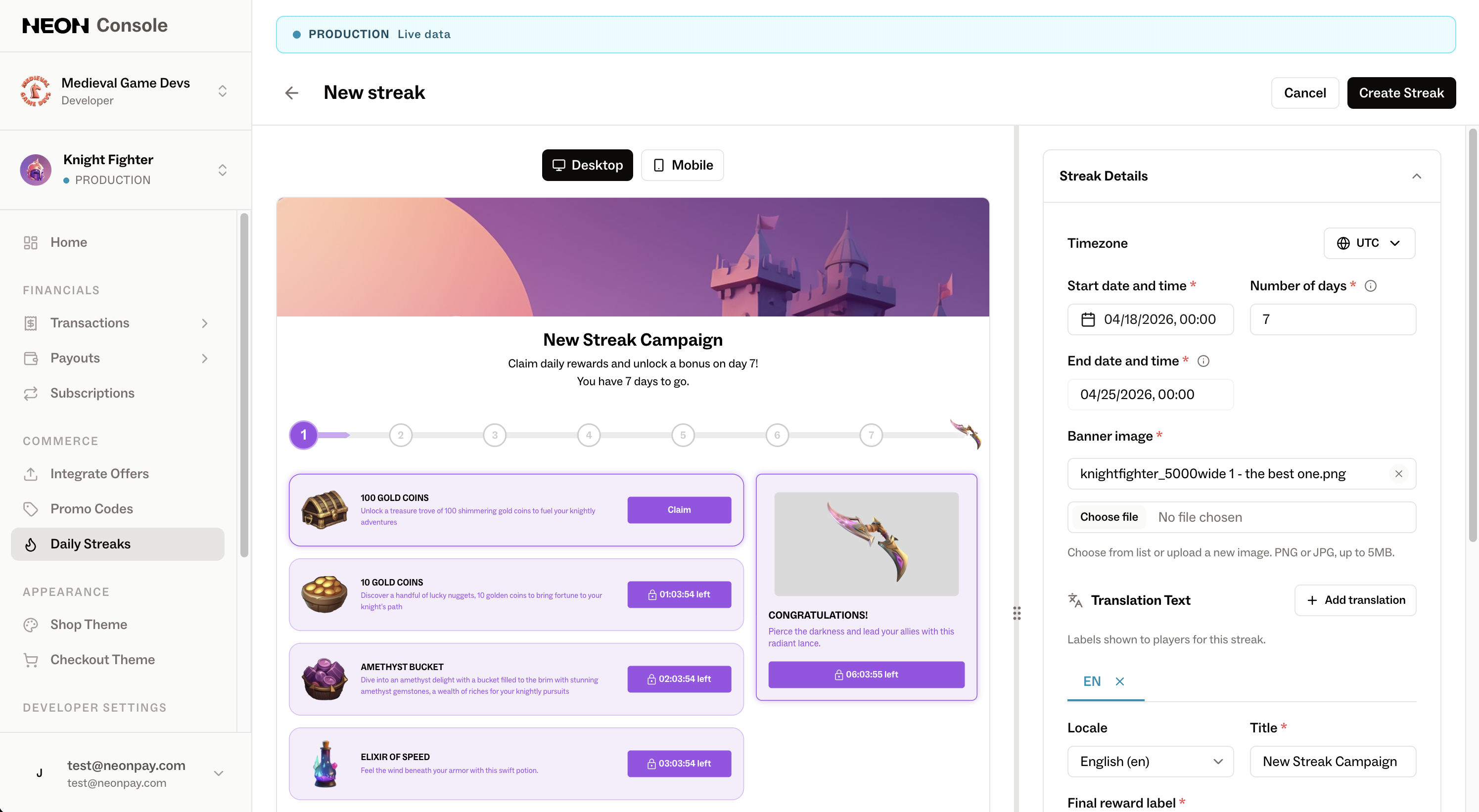 A streak is a scheduled campaign (typically one week long) made up of a set of streak offers — one offer per day plus a final bonus. Players must claim each day in sequence, and the bonus unlocks once the final day is claimed. When a player claims the day's offer, they're shown a claim confirmation that can optionally feature a Neon Shop offer, giving you a natural opportunity to drive store traffic from an engaged player.