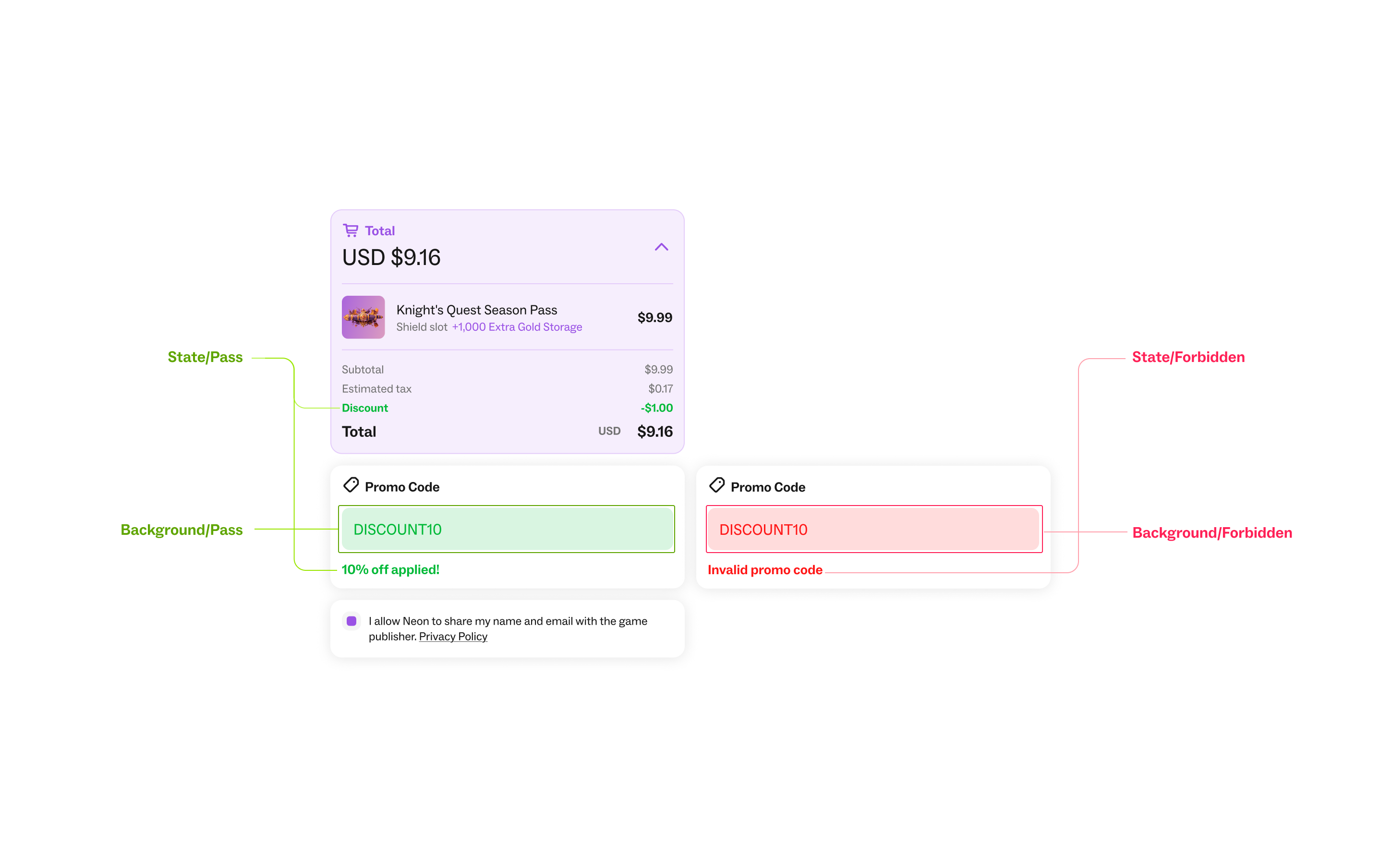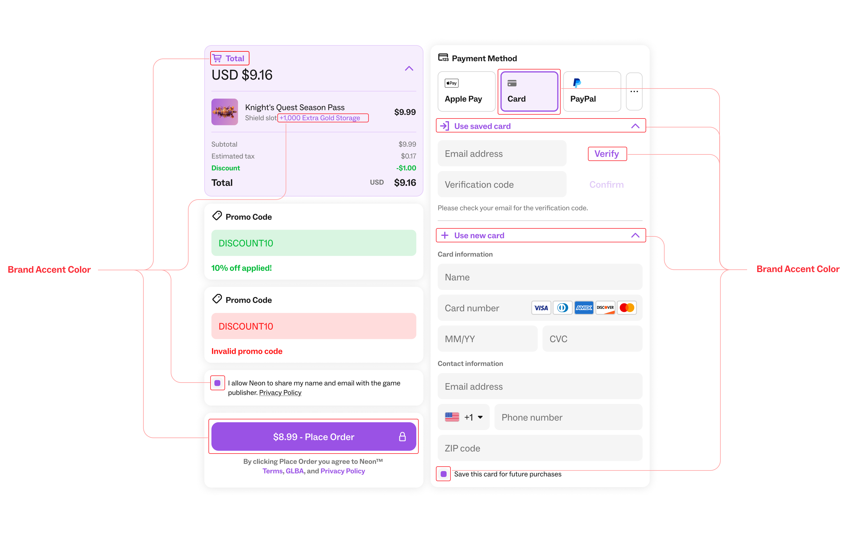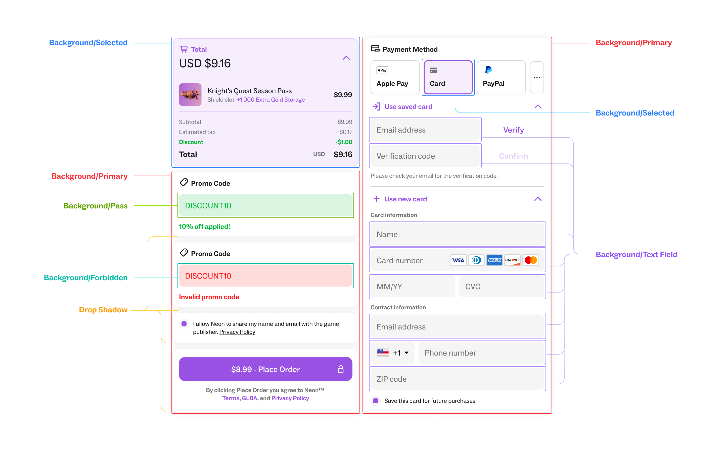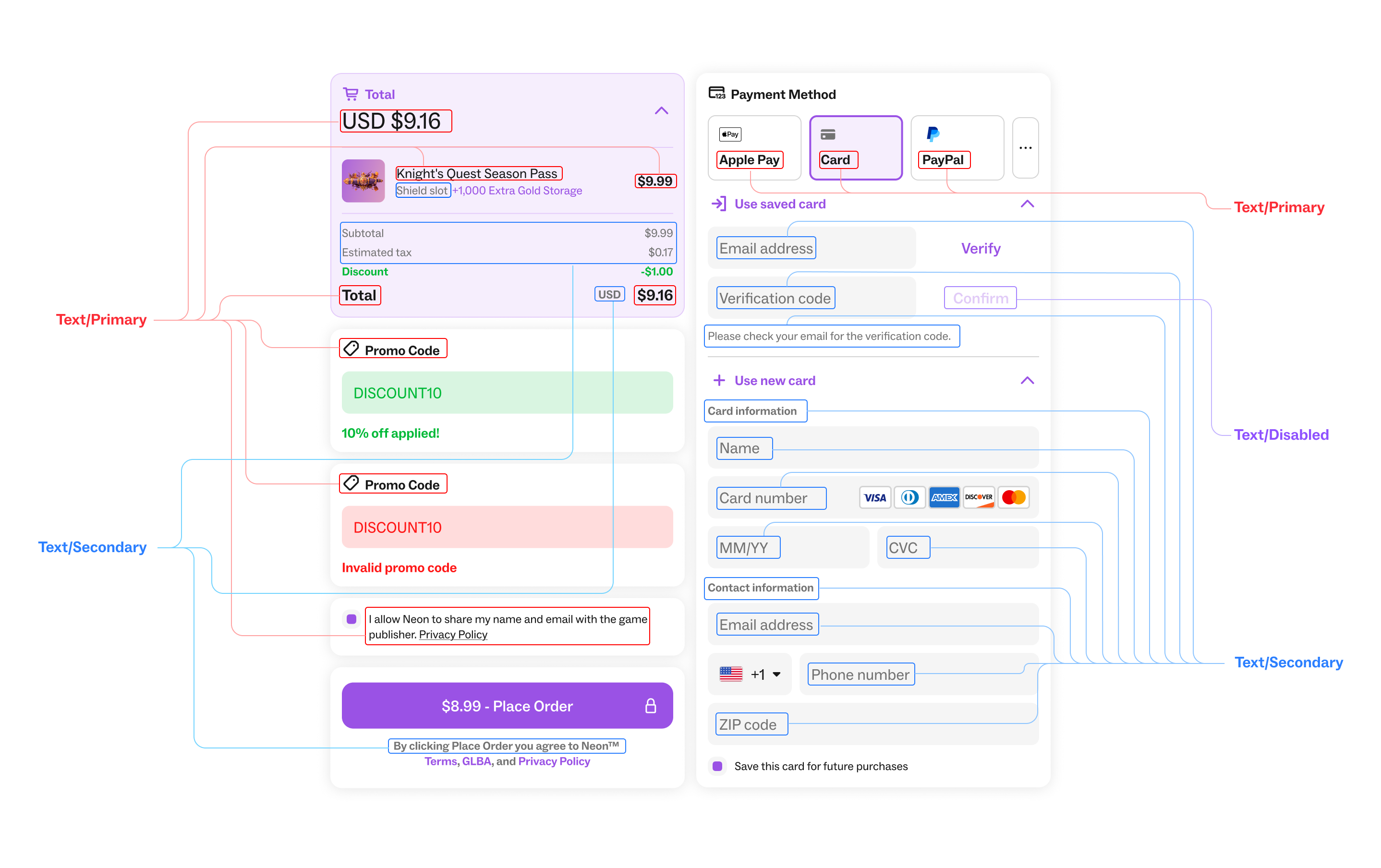 The Customize Checkout Theme page in the Neon Dashboard allows developers to define the visual appearance of the checkout experience for each environment. You can adjust brand, text, background, stroke, and state colors, as well as select a checkout font.
